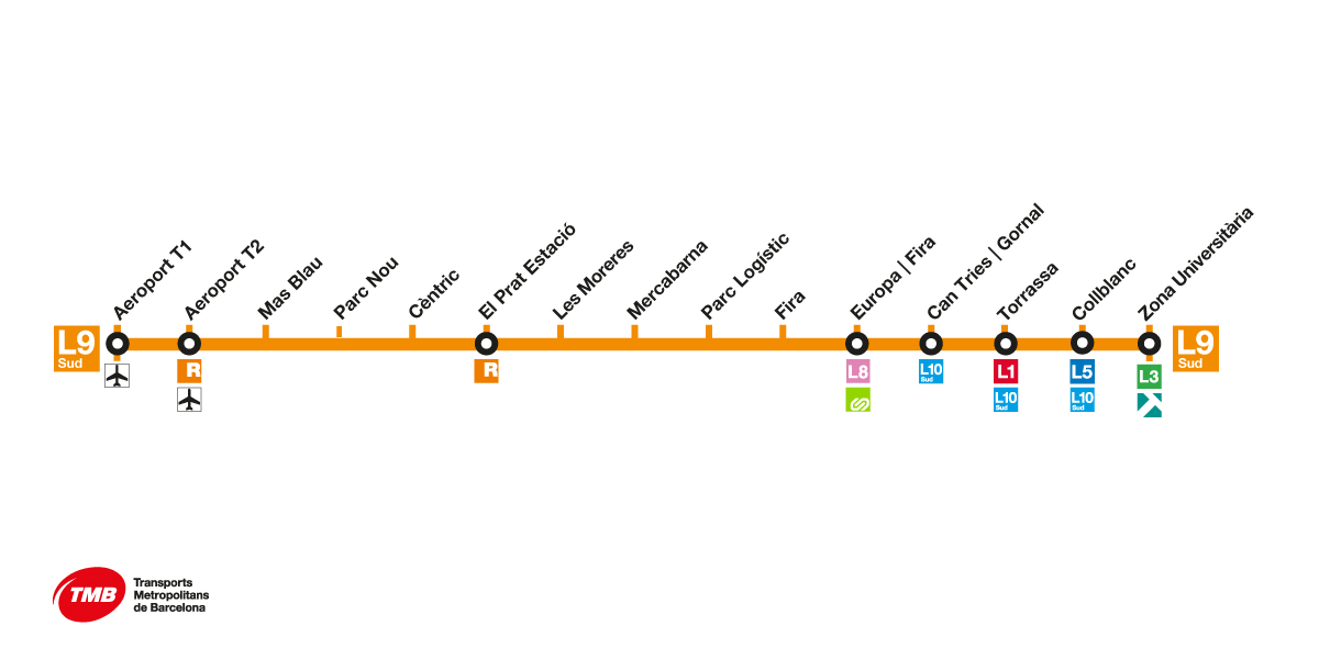 Aeroport T1 – Aeroport T2 – Mas Blau – Parc Nou – Cèntric – El Prat Estació – Les Moreres – Mercabarna – Parc Logístic – Fira – Europa | Fira (correspondance : L8) – Can Tries | Gornal (correspondance : L10 Sud) – Torrassa (correspondance : L1, L10 Sud) – Collblanc (correspondance : L5, L10 Sud) – Zona Universitària